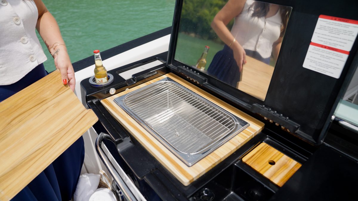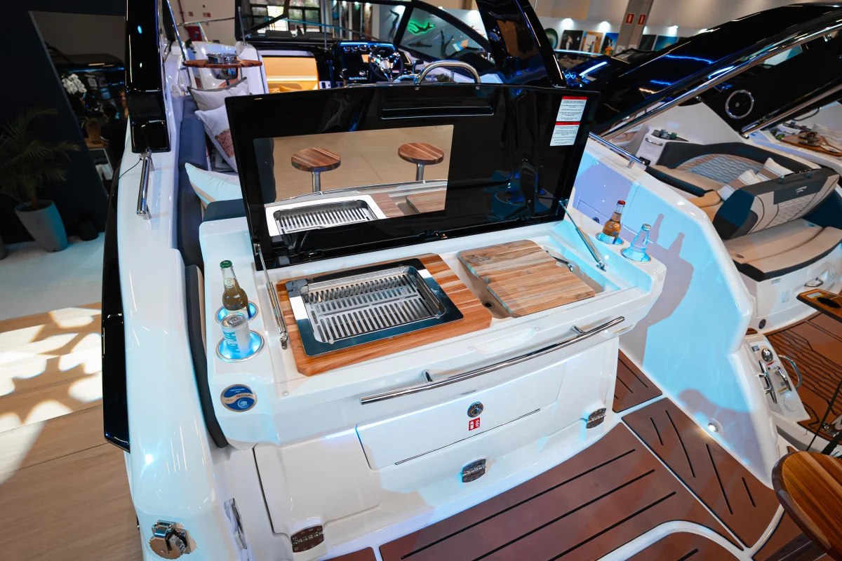 Pensada para quem leva a arte de receber a sério. O espaço gourmet com churrasqueira e cockpit bar transforma qualquer passeio em um encontro memorável. É ali que os brindes acontecem, que a comida reúne as pessoas e que o barco assume, de vez, o papel de cenário das melhores experiências do seu verão.