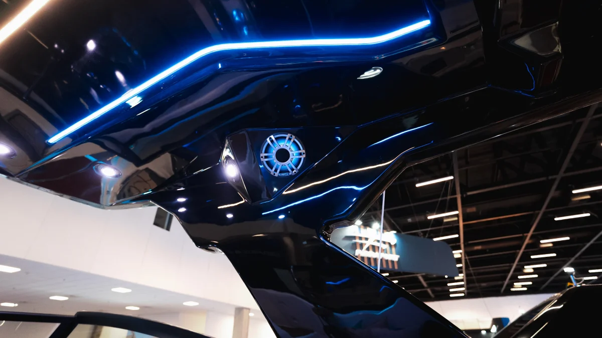 Eleva a experiência social com o novo T-top, que conta com iluminação em LED e alto-falantes integrados. Isso transforma a lancha em um verdadeiro lounge flutuante, onde o clima muda conforme o momento do dia. Durante o pôr do sol ou à noite, a iluminação cria uma atmosfera envolvente, enquanto o som acompanha encontros que se estendem sem pressa.