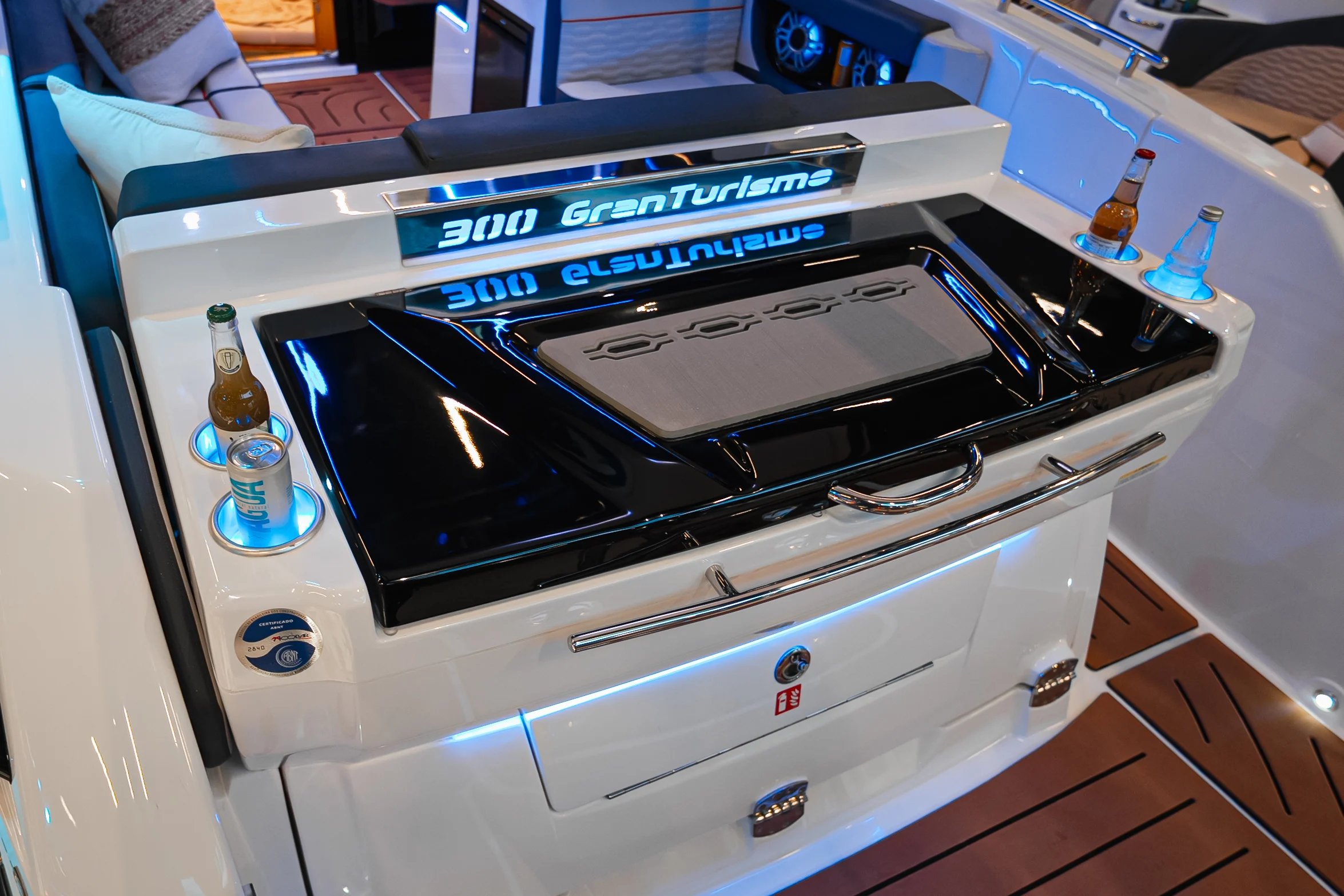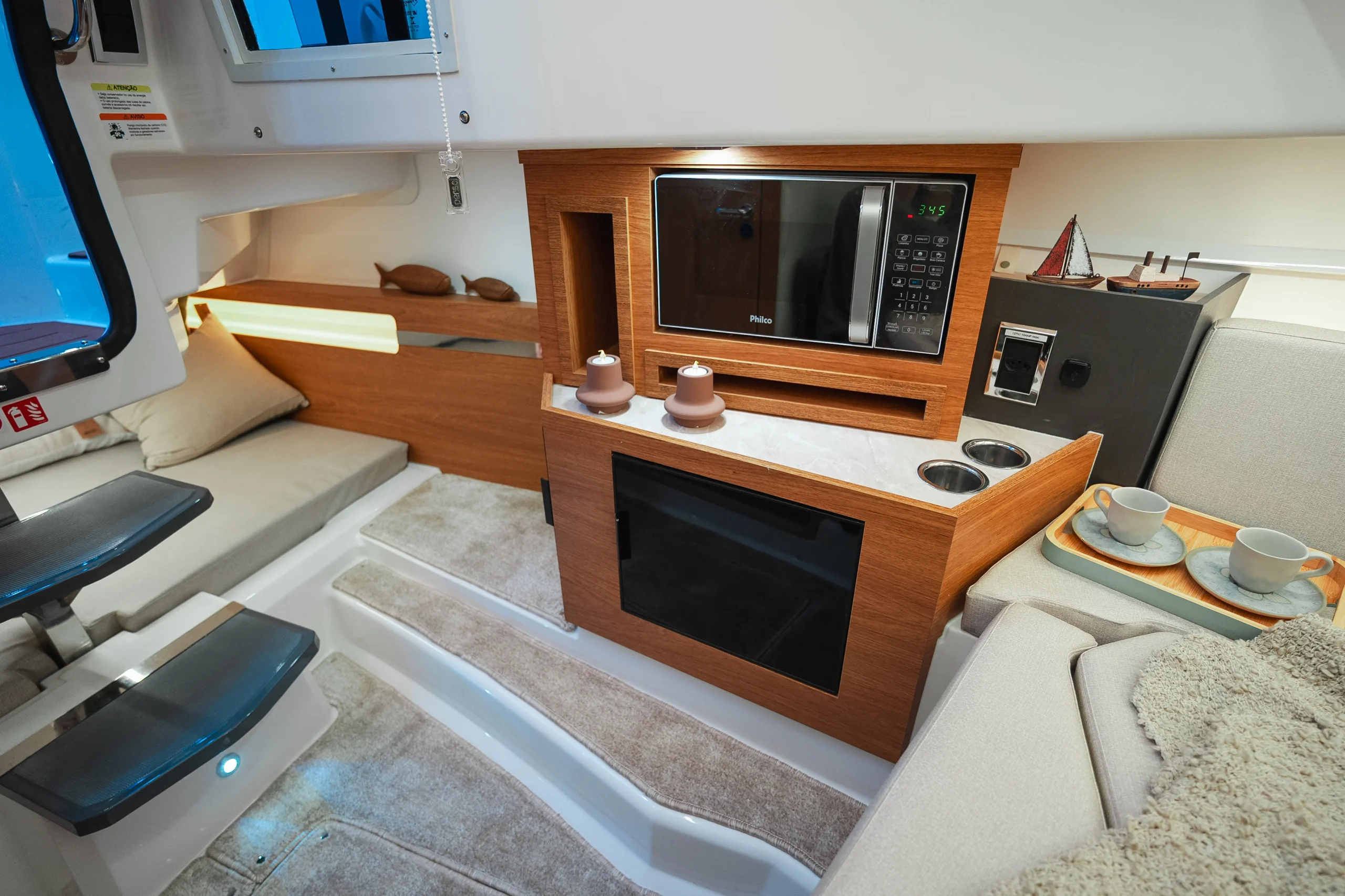 - Área de apoio no cockpit e pia com torneira e opção de geladeira