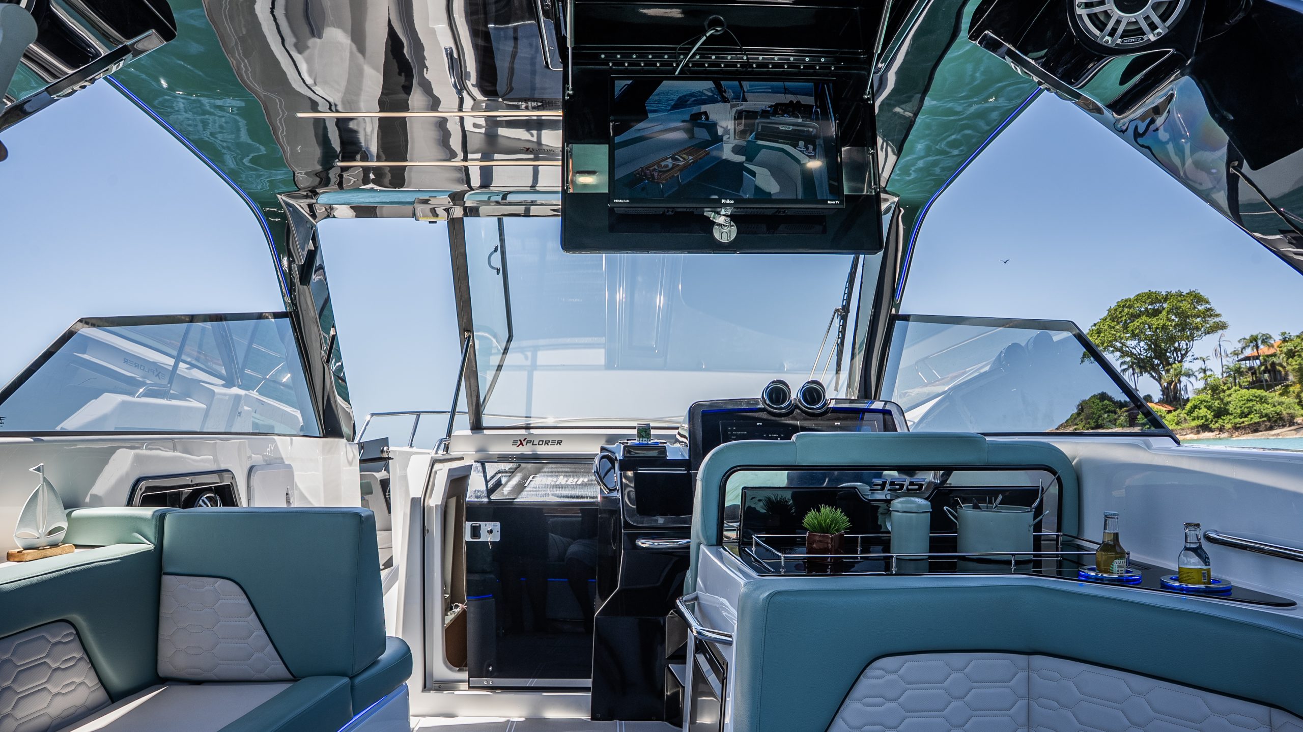 - Cabine espaçosa com 1,80m de pé direito, cama de proa e cama de meia nau, móvel de apoio como cozinha, barzinho acrílico iluminado