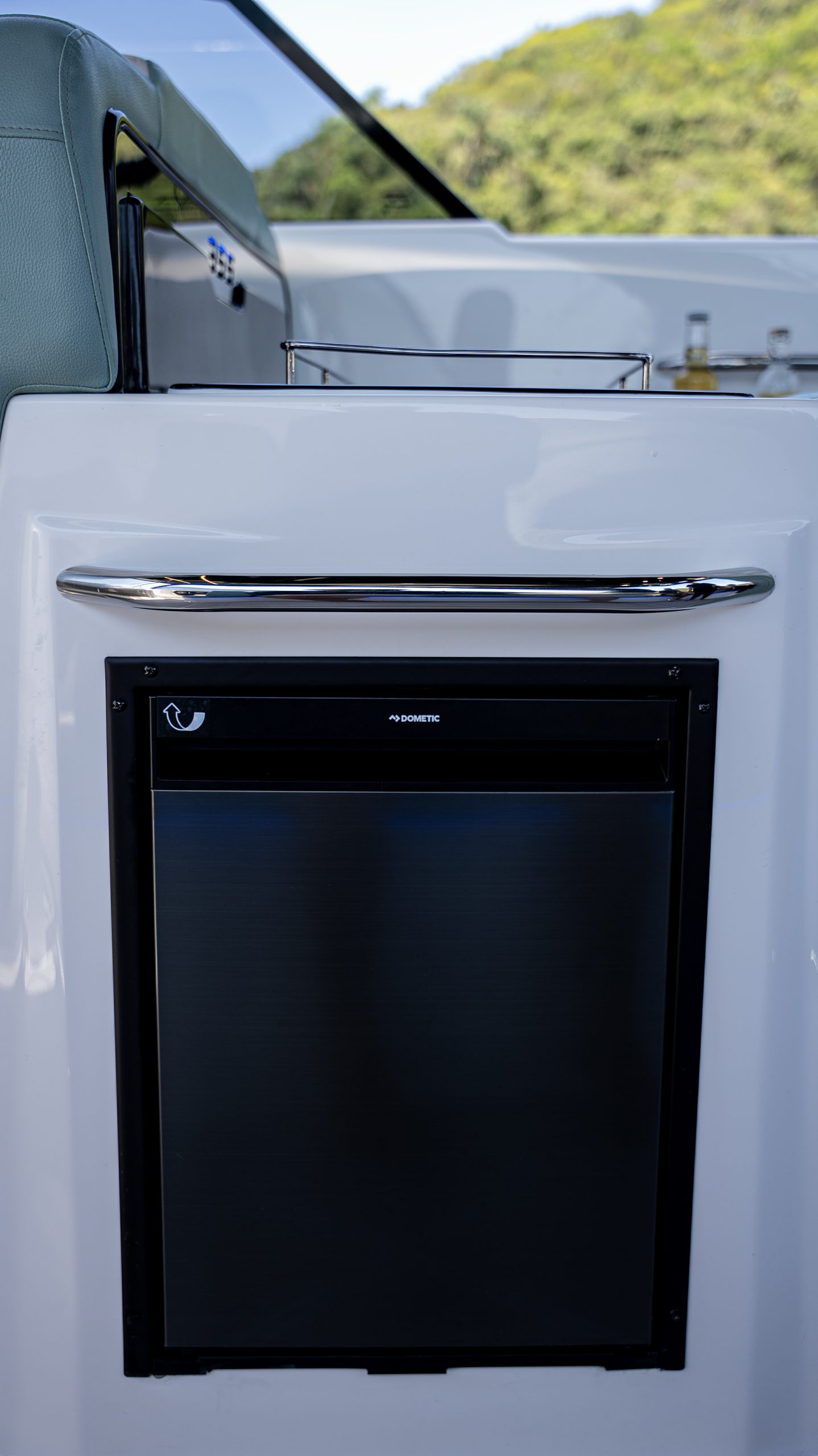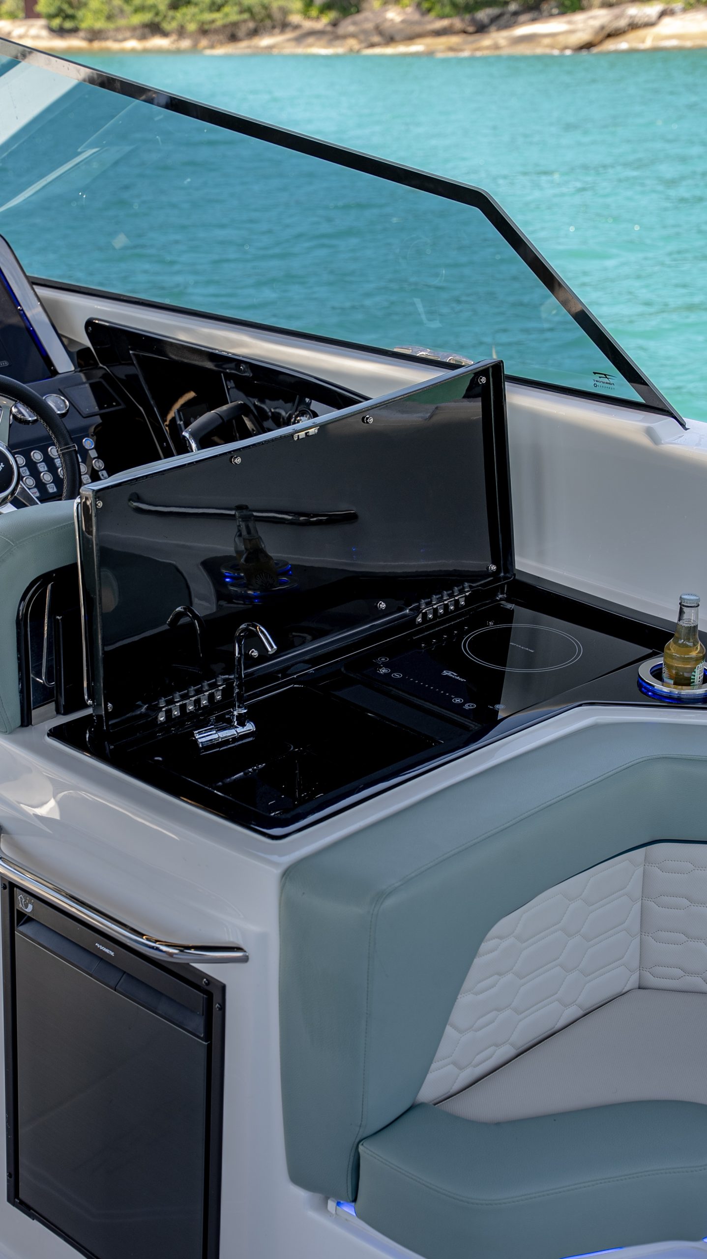 - Área de apoio no cockpit e pia com torneira e geleira
